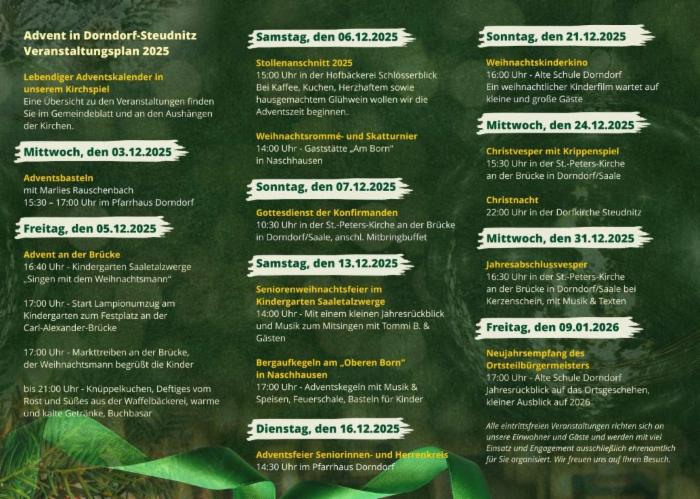 Sich gegenseitig mit einer kleinen adventlichen Auszeit zu überraschen ist in Dorndorf-Steudnitz eine liebgewonnene Tradition geworden, die sich inzwischen in andere Dörfer des Kirchspiels ausgeweitet hat. Zur besseren Abstimmung sind alle Interessierten eingeladen, sich am Dienstag, 21.Oktober, um 18:00 Uhr, im Gemeinderaum Dorndorf zusammenzufinden.