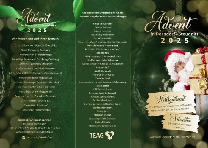 Sich gegenseitig mit einer kleinen adventlichen Auszeit zu überraschen ist in Dorndorf-Steudnitz eine liebgewonnene Tradition geworden, die sich inzwischen in andere Dörfer des Kirchspiels ausgeweitet hat. Zur besseren Abstimmung sind alle Interessierten eingeladen, sich am Dienstag, 21.Oktober, um 18:00 Uhr, im Gemeinderaum Dorndorf zusammenzufinden.